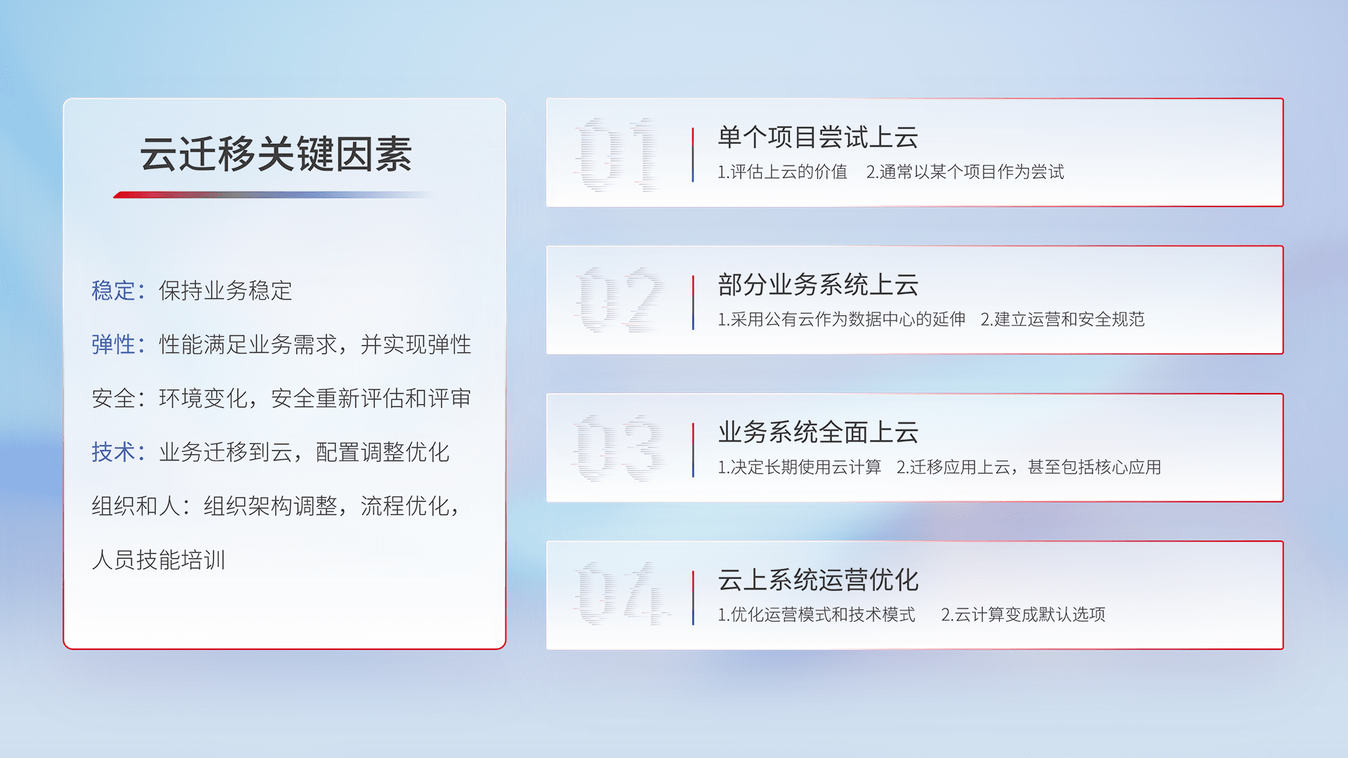 结合实际业务,,,,从规划设计、、、、云平台选型、、、、云原生改造、、、、数据迁移、、、集成交付,,迁移全过程为客户识别最佳上云路径,,,做好风险识别管理,,,设计网络架构、、身份权限、、、、安全审计合规、、、操作审计、、、日志审计、、、、监控告警策略、、、多站点容灾设计等,,,,对云上基础设施进行整体规划,,,,提升IT治理水平,,以满足弹性、、、高可用、、、、高性能的需求。。。。